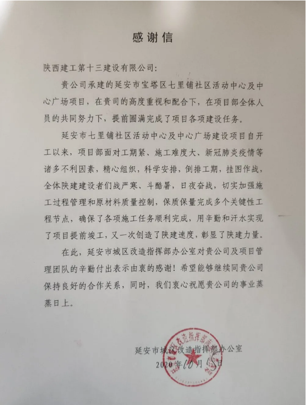 在繼南川河防洪工程、延安大學(xué)新校區(qū)體育中心項(xiàng)目之后,10月15日,公司負(fù)責(zé)施工的延安市七里鋪社區(qū)活動(dòng)中心及中心廣場(chǎng)項(xiàng)目收到了來自建設(shè)單位的感謝信。延安市城區(qū)改造指揮部在感謝信中提到:陜建十三建公司延安寶塔區(qū)七里鋪社區(qū)活動(dòng)中心及中心廣場(chǎng)項(xiàng)目全體建設(shè)者戰(zhàn)嚴(yán)寒、斗酷暑,日夜奮戰(zhàn),切實(shí)加強(qiáng)施工過程管理和質(zhì)量控制,保質(zhì)保量完成了多個(gè)關(guān)鍵性工程節(jié)點(diǎn),確保了各項(xiàng)施工任務(wù)順利完成,用辛勤和汗水實(shí)現(xiàn)了項(xiàng)目提前竣工,又一次創(chuàng)造了陜建速度,彰顯了陜建力量。