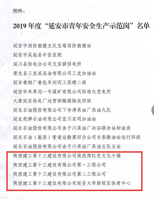近日,共青團(tuán)延安市委、延安市應(yīng)急管理局、延安市青年聯(lián)合會聯(lián)合下發(fā)《關(guān)于命名表彰2019年度延安市青年安全生產(chǎn)示范崗的決定》,陜建十三建公司第一工程公司、第二工程公司、南泥灣紅色文化小鎮(zhèn)項目部、延安大學(xué)新校區(qū)體育中心項目部四個集體榮獲2019年度“延安市青年安全生產(chǎn)示范崗”榮譽稱號。